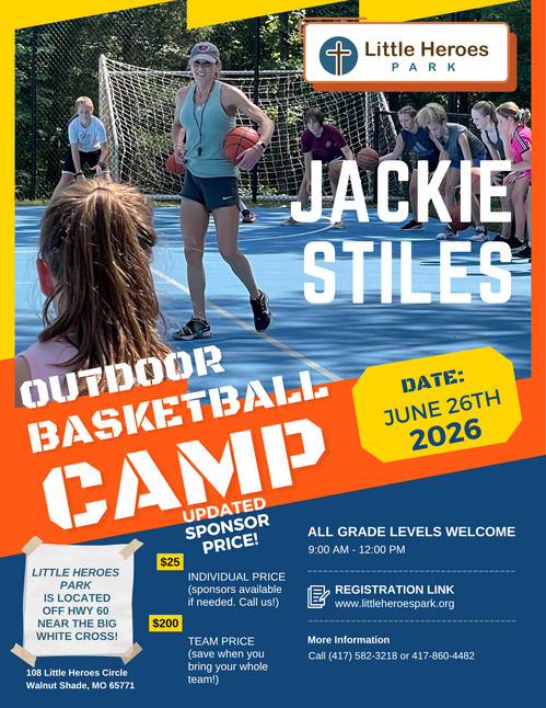 Little Heroes Park is excited to welcome players of all grade levels to the Outdoor Basketball Camp on June 26, 2026, from 9:00 a.m. to 12:00 p.m. with special guest Jackie Stiles. This camp is a great opportunity for young athletes to build basketball fundamentals, grow their confidence, and learn in an encouraging outdoor setting. Jackie Stiles brings a level of experience and inspiration that makes this event especially meaningful. She starred at Southwest Missouri State, now Missouri State, and retired as the all-time leading scorer in Division I women’s basketball with 3,393 points. She was also the first and only Division I women’s player to score more than 1,000 points in a single season, later becoming the No. 4 overall pick in the 2001 WNBA Draft, the 2001 WNBA Rookie of the Year, and a WNBA All-Star. Jackie’s story of hard work, toughness, and excellence gives campers the chance to learn not just skills on the court, but also what it looks like to compete with heart and determination.